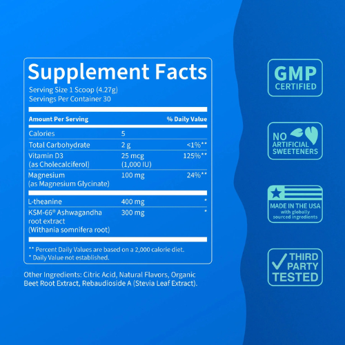 Supports mood, focus, and cognitive function. Supercalm contains 400mg of L-theanine per serving.